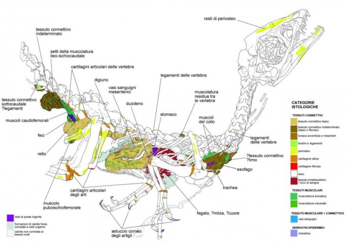 , una varietà incredibile di tessuti molli interni, tra cui legamenti intervertebrali, cartilagini articolari nelle ossa delle zampe, muscoli e connettivi del collo, parte della trachea, residui dell'esofago, tracce del fegato e di altri organi ricchi di sangue, l'intero intestino, vasi sanguigni mesenterici, capillari, muscoli del cinto pelvico, degli arti posteriori e della coda, tutti ben visibili sino a livello subcellulare.