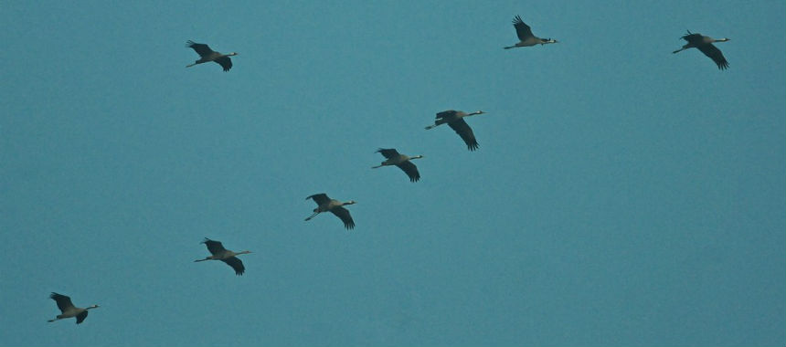 Pochi giorni trascorsi alla ricerca di cibo e, a fine febbraio, ogni gru "riattiva" il senso migratorio. Quando il libeccio alza le prime penne, i colli si allungano all'unisono, le ali si dispiegano e le zampe si staccano dal suolo: e si vola via!