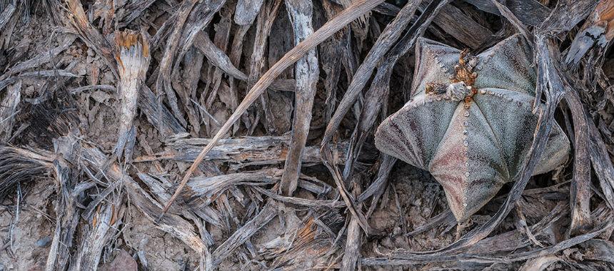 Durante una spedizione di 15 giorni nel deserto di Chihuahua in Messico, ho trovato questa giovane pianta di Astrophitum tra i resti di agavi morte. Nel caldo torrido, ho cercato di incorniciare con attenzione il cactus tra i resti delle agave, le texture erano ricche di toni grazie alla luce morbida di quel momento creatasi grazie ad una rara conformazione nuvolosa.