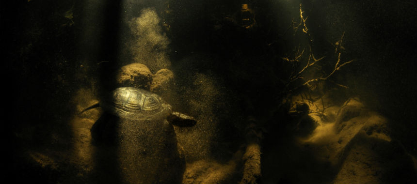 La calura estiva della Sardegna aveva ridotto il fiume montano a una serie di piccole pozze ma avevo deciso comunque di entrare nell'acqua torbida. Il mio scopo era documentare l'elusiva testuggine palustre europea per il libro "I tesori del fiume". A dispetto della distribuzione ampia in Europa centrale e meridionale, molte popolazioni sono in declino, minacciate da inquinamento, perdita di habitat e introduzione di specie americane competitrici. Individui con grandi quantità di giallo nella livrea sono anche molto ricercati dai bracconieri per il commercio illegale. Quando un malfunzionamento dei flash mi ha impedito di utilizzarli... la sfida è stata mantenere inquadrata la testuggine mentre scivolava sul fondo tra i giochi di luci e ombre, sollevando nuvole di fango. E' stato essenziale per me trasmettere il senso del luogo. Per questo ho scelto una inquadratura larga, che includesse la drammaticità dei raggi di sole in caduta attraverso gli spazi della vegetazione della riva, per illuminare un ritratto d'atmosfera.