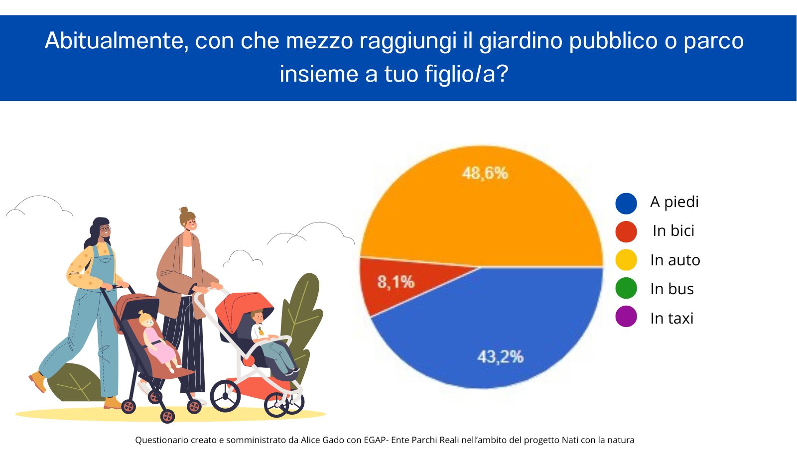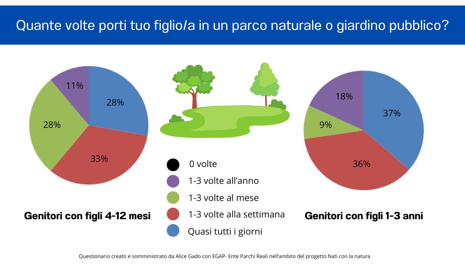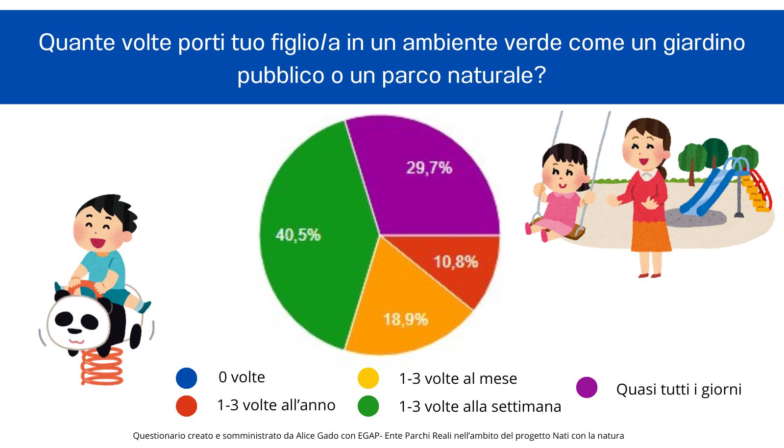 Hanno partecipato 36 genitori a cui è stato chiesto quante volte, dove e con quali mezzi portano i loro figli in un giardino o parco pubblico. Il 10,8% degli intervistati porta solo 1-3 volte l'anno il proprio figlio/a in un ambiente verde mentre ben il 70,2% li porta da una volta alla settimana a quasi tutti i giorni