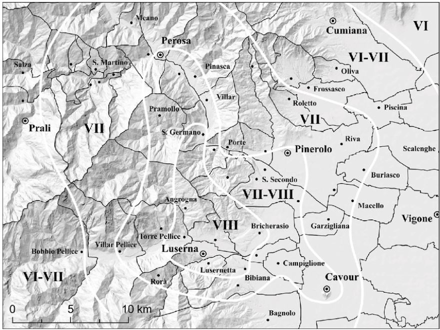 (Carta delle isosiste - Gianfranco Fioraso "La Terra trema"), entrambi con magnitudo stimata pari a circa 5.7 Mw. Sismi di magnitudo maggiore sono avvenuti a relativamente breve distanza dai confini regionali, tali da produrre effetti apprezzabili anche in Piemonte: si ricorda in particolare l'evento del 23 febbraio del 1887 nei pressi della costa ligure occidentale, a meno di 50 km dai confini piemontesi, che distrusse Bussana Vecchia e ebbe una magnitudo stimata pari a 7.0 Mw.