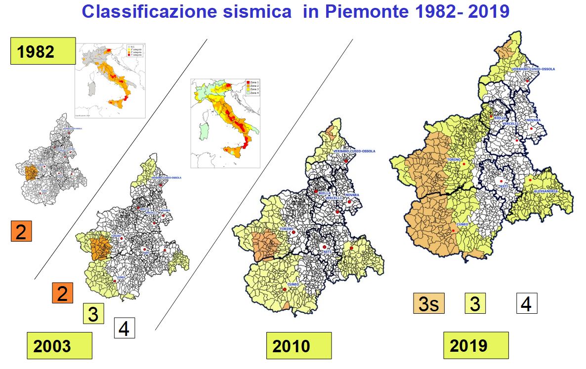 In Piemonte la prima classificazione sismica del territorio regionale è stata decretata nel 1982 facendo riferimento principalmente al terremoto del 1808 e di conseguenza comprendeva solo una quarantina di comuni del Pinerolese, mentre la restante parte della regione risultava non classificata.