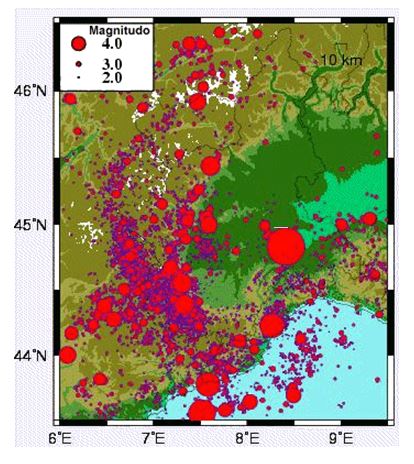 (Distribuzione epicentri misurati dalla rete sismica – arch. Arpa Piemonte), i cui epicentri si concentrano lungo due direttrici, note storicamente come arco sismico piemontese e arco sismico brianzonese.