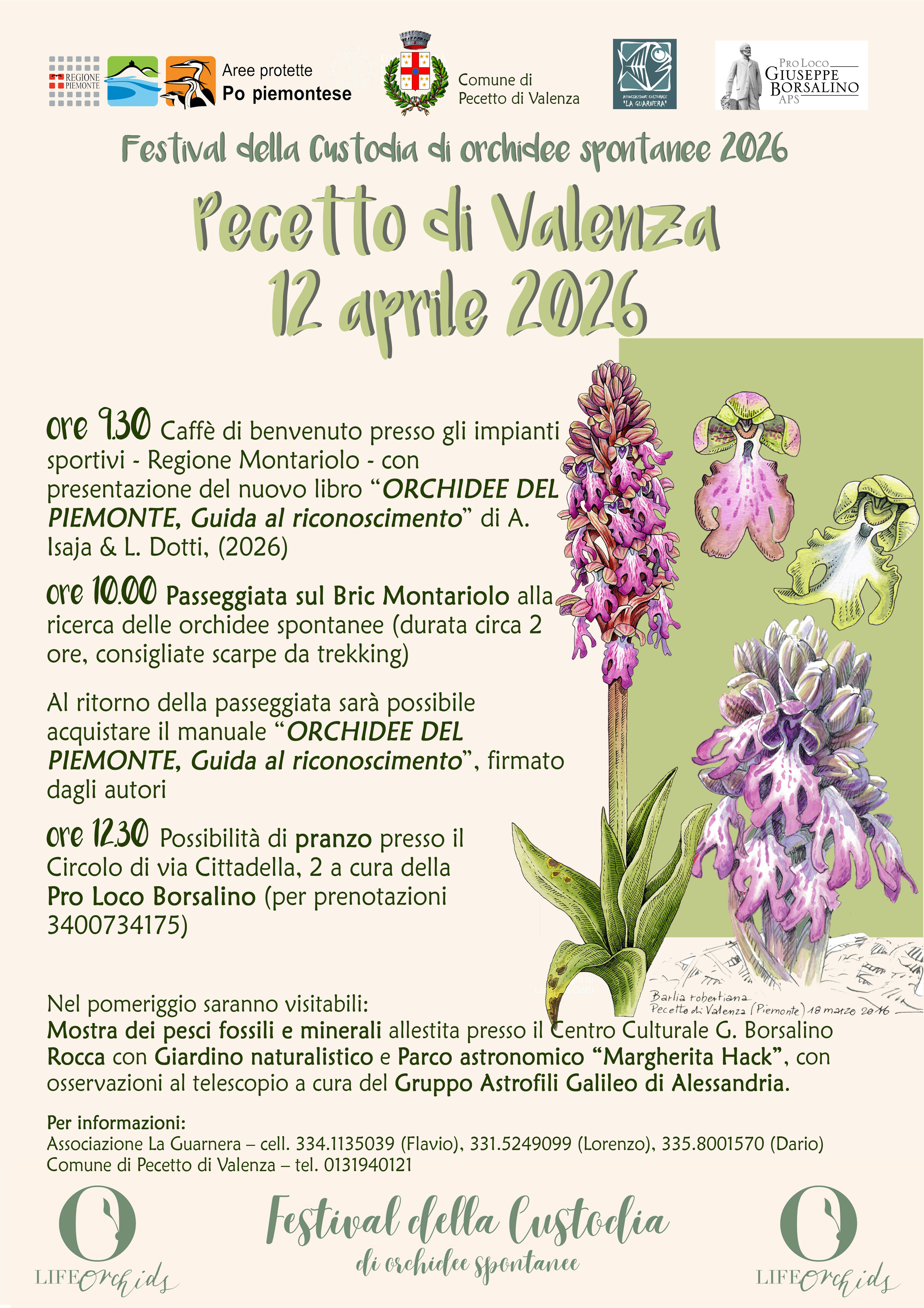 La giornata, organizzata in collaborazione tra l'Ente di gestione delle Aree protette del Po piemontese, il Comune di Pecetto, l'Associazione La Guarnera e la Pro loco Borsalino, inizia alle ore 9.30, con il caffè di benvenuto presso gli impianti sportivi e la presentazione del nuovo libro "ORCHIDEE DEL PIEMONTE, Guida al riconoscimento" di A. Isaja & L. Dotti, (2026).