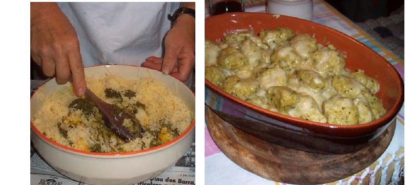 Impastare il tutto e lasciar riposare. Fare poi grossi gnocchi con un cucchiaio, passarli nella farina e metterli a cuocere in acqua salata bollente, per venti minuti/mezz'ora e scolate.