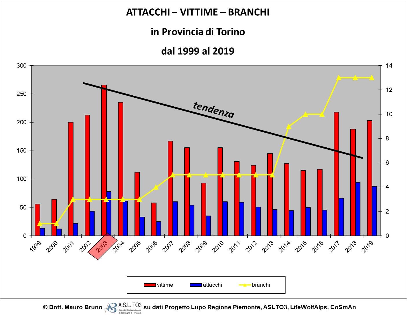 Tra il 1 gennaio e il 31 dicembre 2019 in Piemonte sono stati documentati 180 episodi di predazione su animali domestici che hanno causato 333 morti di pecore o capre e 39 di bovini. I numeri e i luoghi degli attacchi sono riassunti in questo grafico