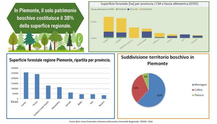 Il Piemonte è ad oggi una delle regioni con la più ampia superficie forestale arborea d'Italia con 976.953 ettari complessivi (fonte dati SIFOR 2016). In passato però, le nostre foreste hanno subito forti disboscamenti, pascolamenti intensi, introduzione di specie invasive alloctone, incendi dolosi e non sempre è stata posta la giusta attenzione alla pianificazione di una corretta gestione selvicolturale. Negli ultimi decenni la gestione delle foreste è stata però migliorata, permettendo ai boschi di riacquistare il loro spazio soprattutto a seguito della spontanea ricolonizzazione di superfici agricole in zone collinari o montane inutilizzate.