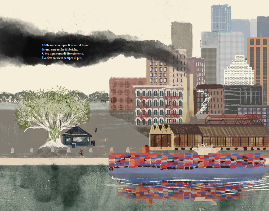 Col passare del tempo, arriva anche la città e "l'albero era sempre lì vicino al fiume. Erano nate molte fabbriche. C'era ogni sorta di divertimento."