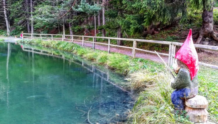 La prima tappa obbligatoria è fermarsi a riposare nel laghetto artificiale della Ghiacciaia, insieme ai suoi simpatici gnomi di legno, che spuntano a ridosso della radura, regalando all'arrivo una piacevole sensazione di freschezza.