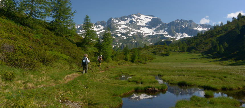 Tra i villaggi Walser del vallone, un ambiente pastorale accogliente, necessario per far decantare i tanti passi alla luce abbagliante dei ghiacciai.