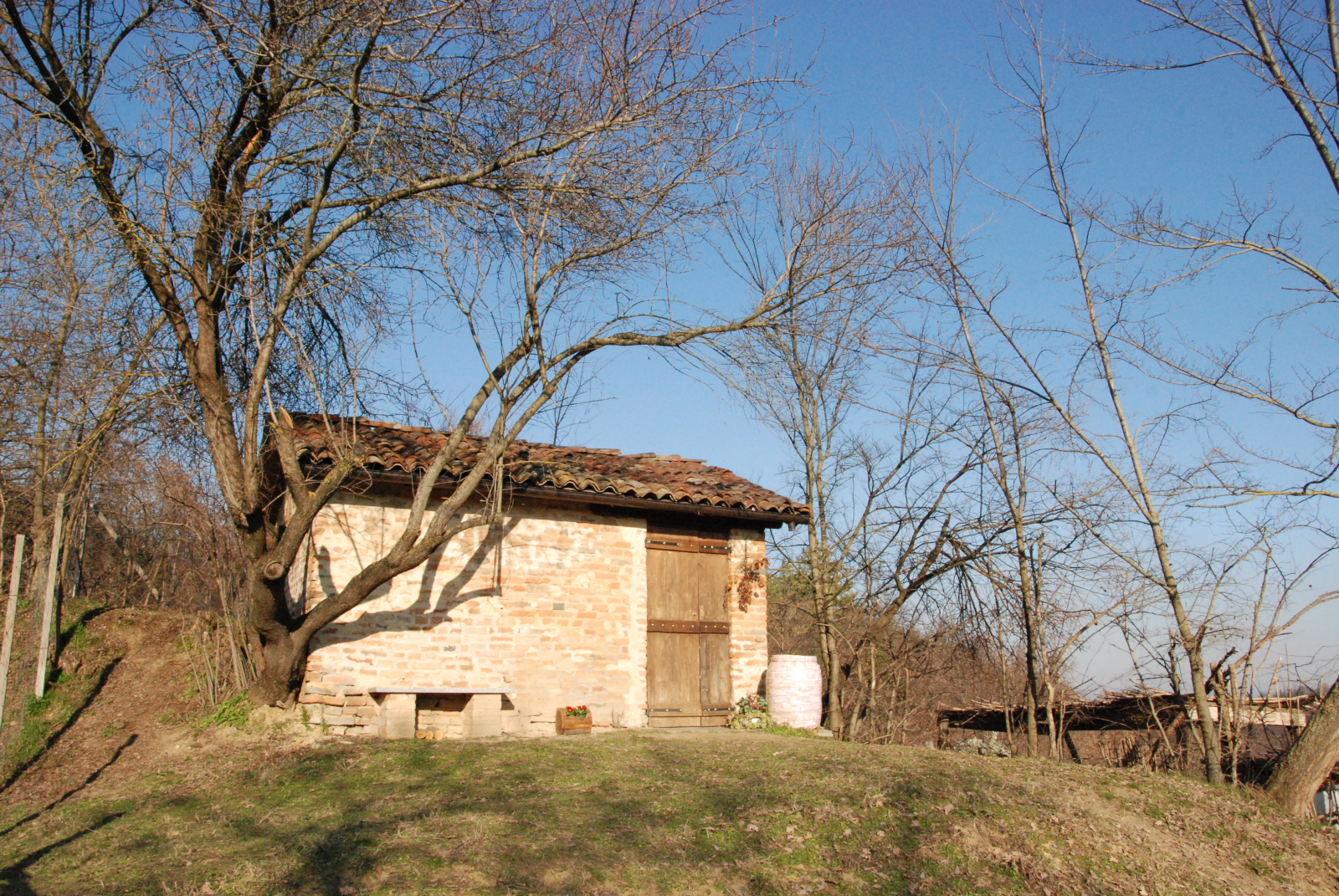 , il primo di una serie. Si tratta di piccole architetture partecipi del mondo contadino, costruite per il ricovero degli attrezzi di lavoro agricolo, in particolare la viticoltura, e all'occorrenza utili per trovare riparo. Elementi che, unitamente ai tanti trogoli che vedremo nel bosco, raccontano di un paesaggio che un tempo era prevalentemente vitato, mentre oggi è stato in parte rinaturalizzato con lo sviluppo di piante pioniere.