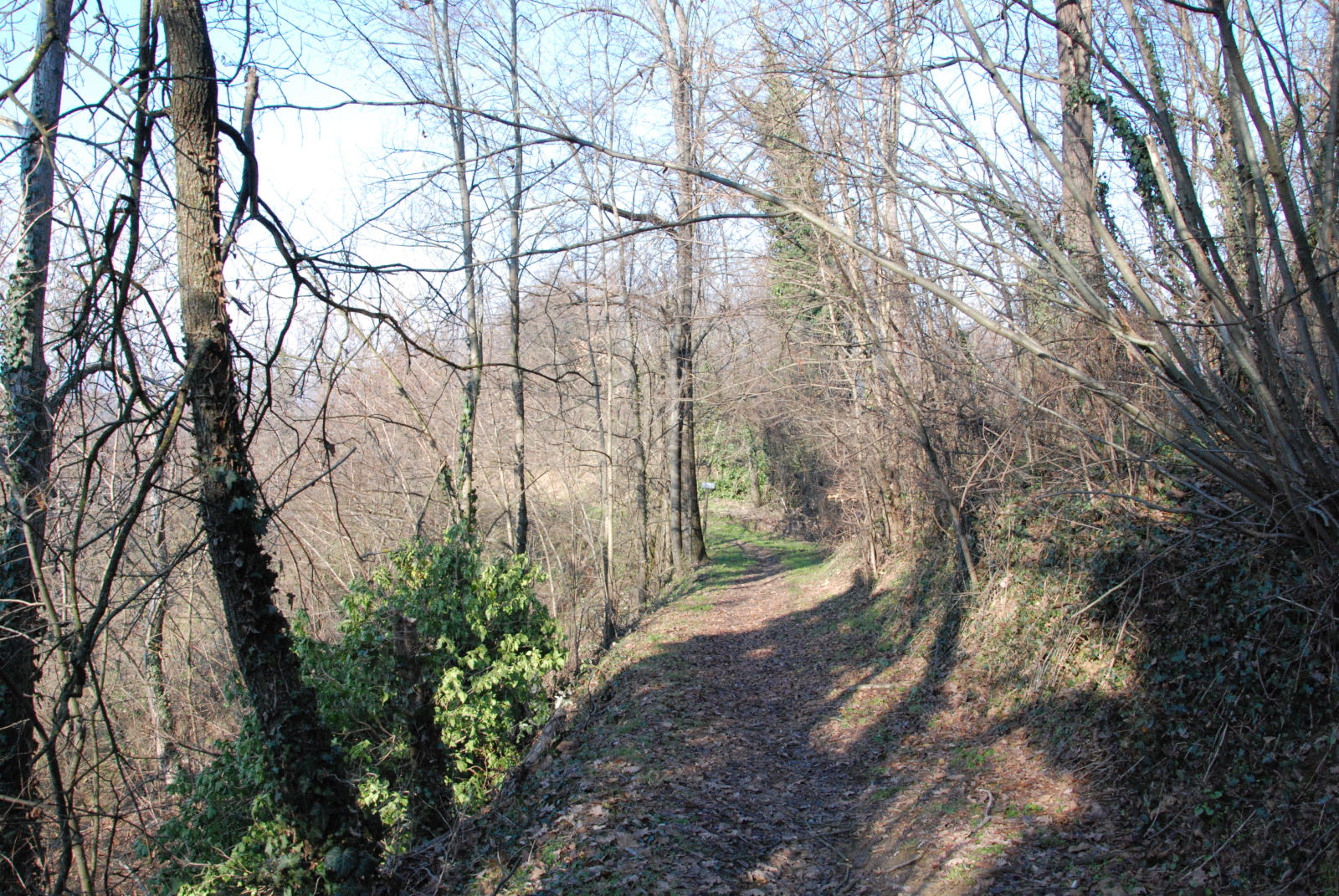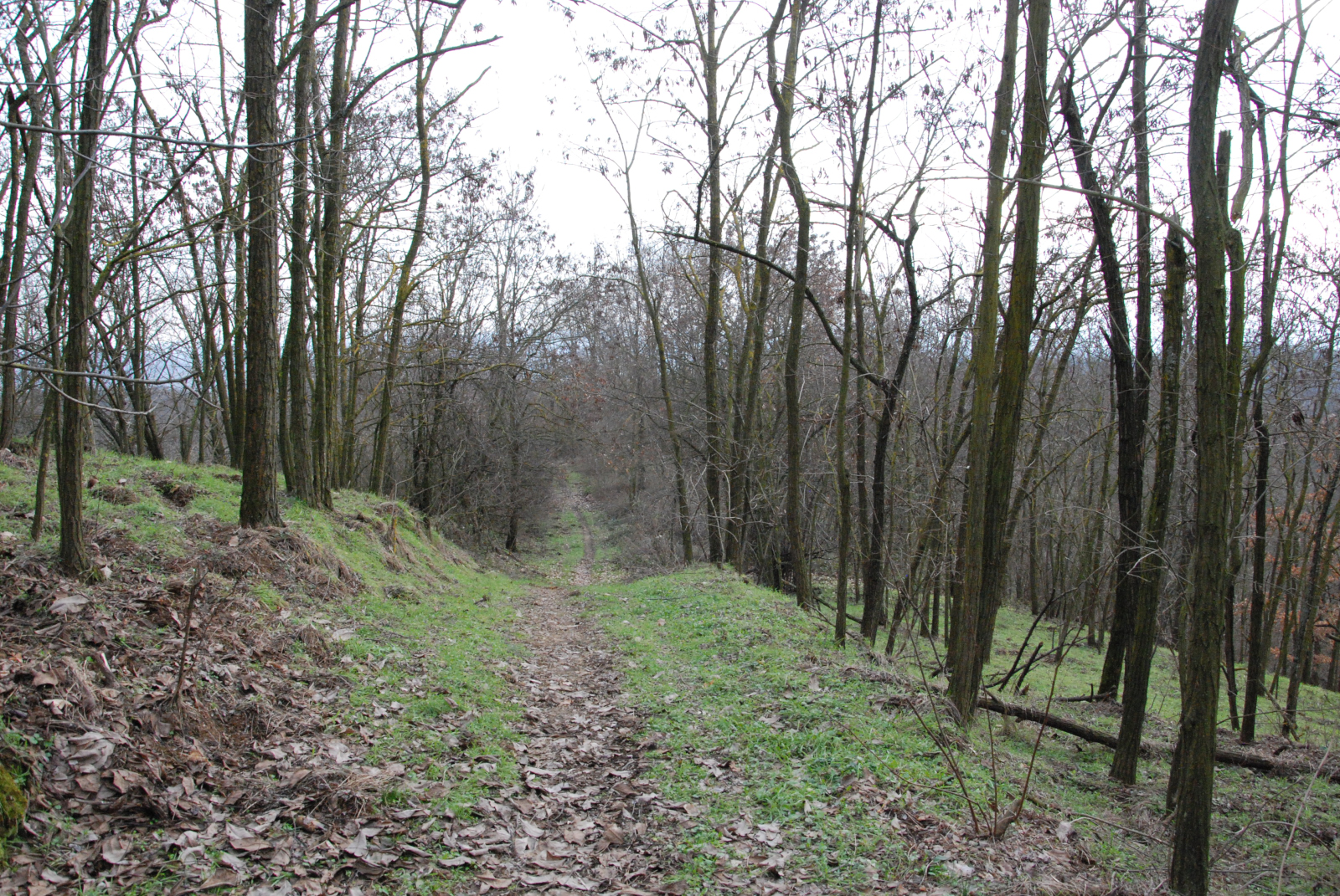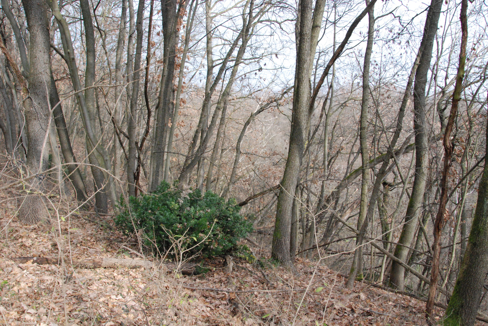 . A poca distanza dall'apice del colle appaiono evidenti, tra gli alberi privi di foglie, verdi cespugli di pungitopo