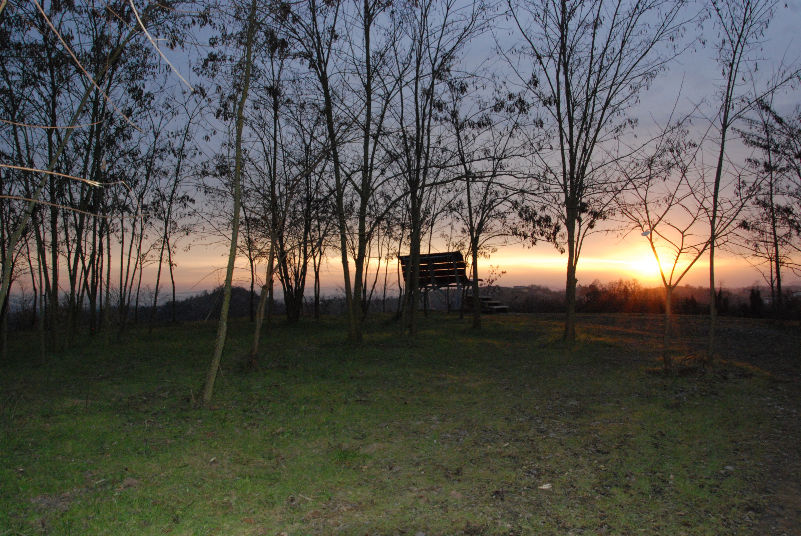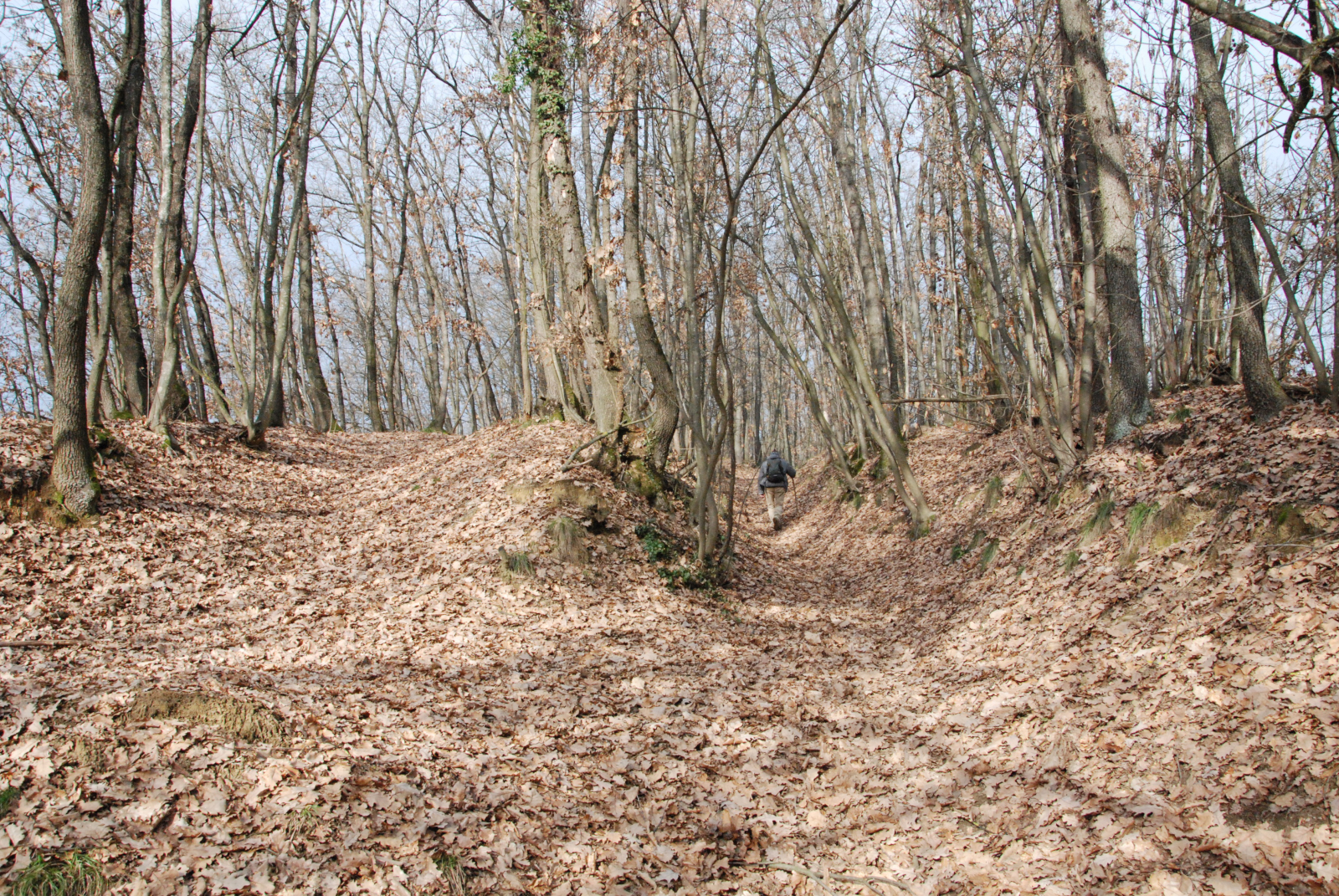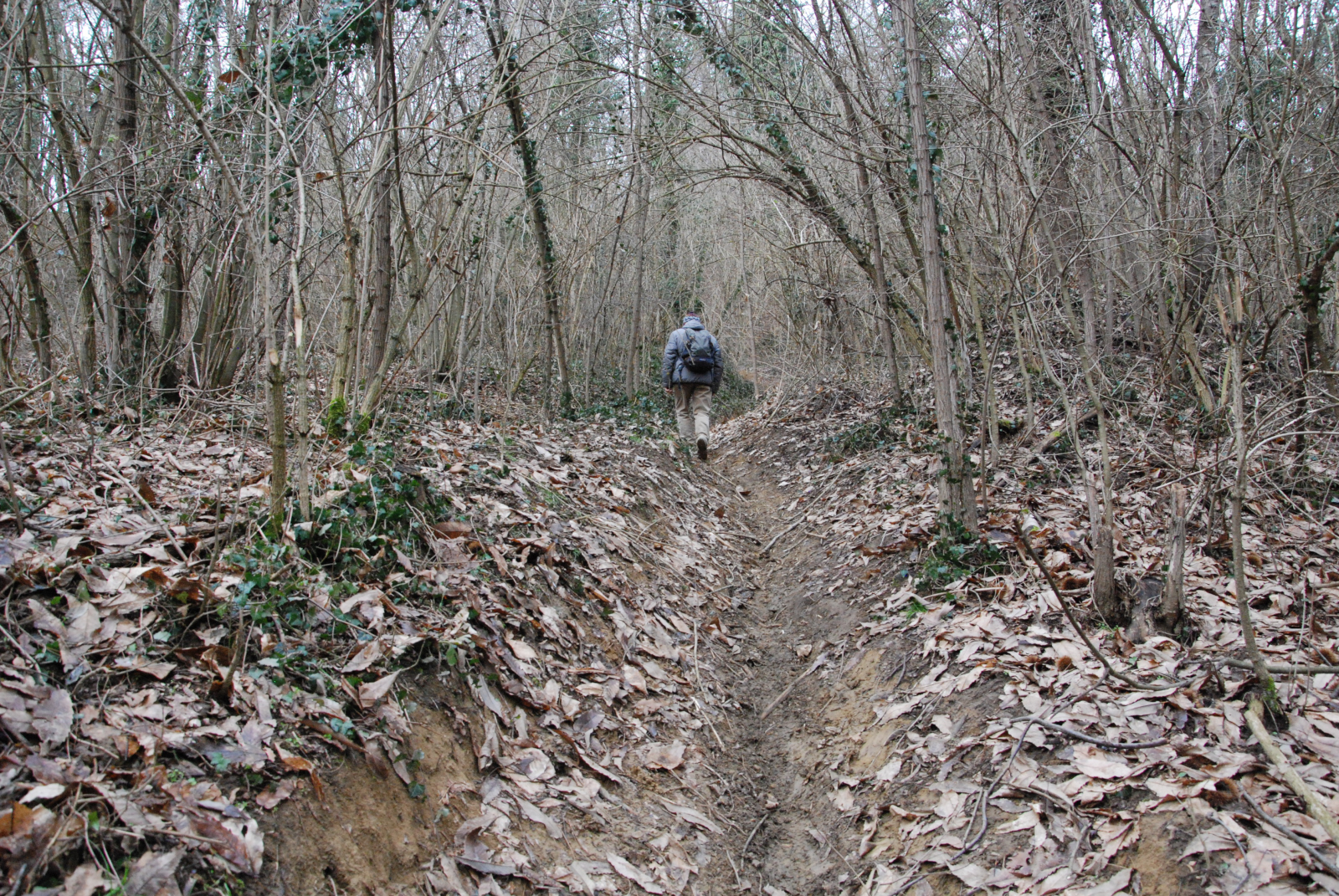 . A poca distanza dall'apice del colle appaiono evidenti, tra gli alberi privi di foglie, verdi cespugli di pungitopo