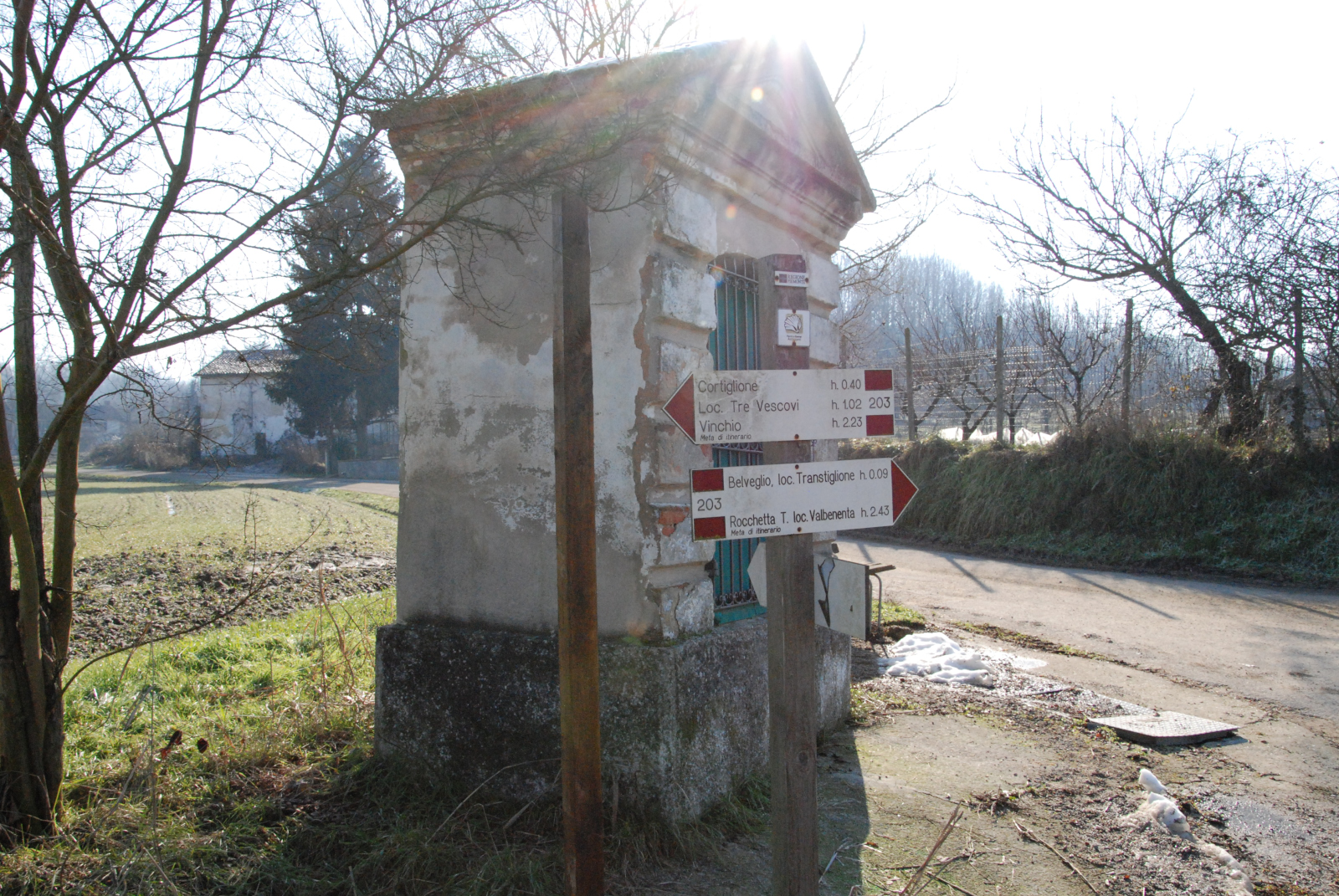 . Si prosegue ancora in discesa fino a raggiungere il fondovalle della Valle Valtinverno. Raggiunto il piano si è di fronte ad un quadrivio, è evidente, per la presenza di una vicina cascina, che si è arriati al limitare dell'abitato di Incisa Scapaccino, come indicano i segnavia