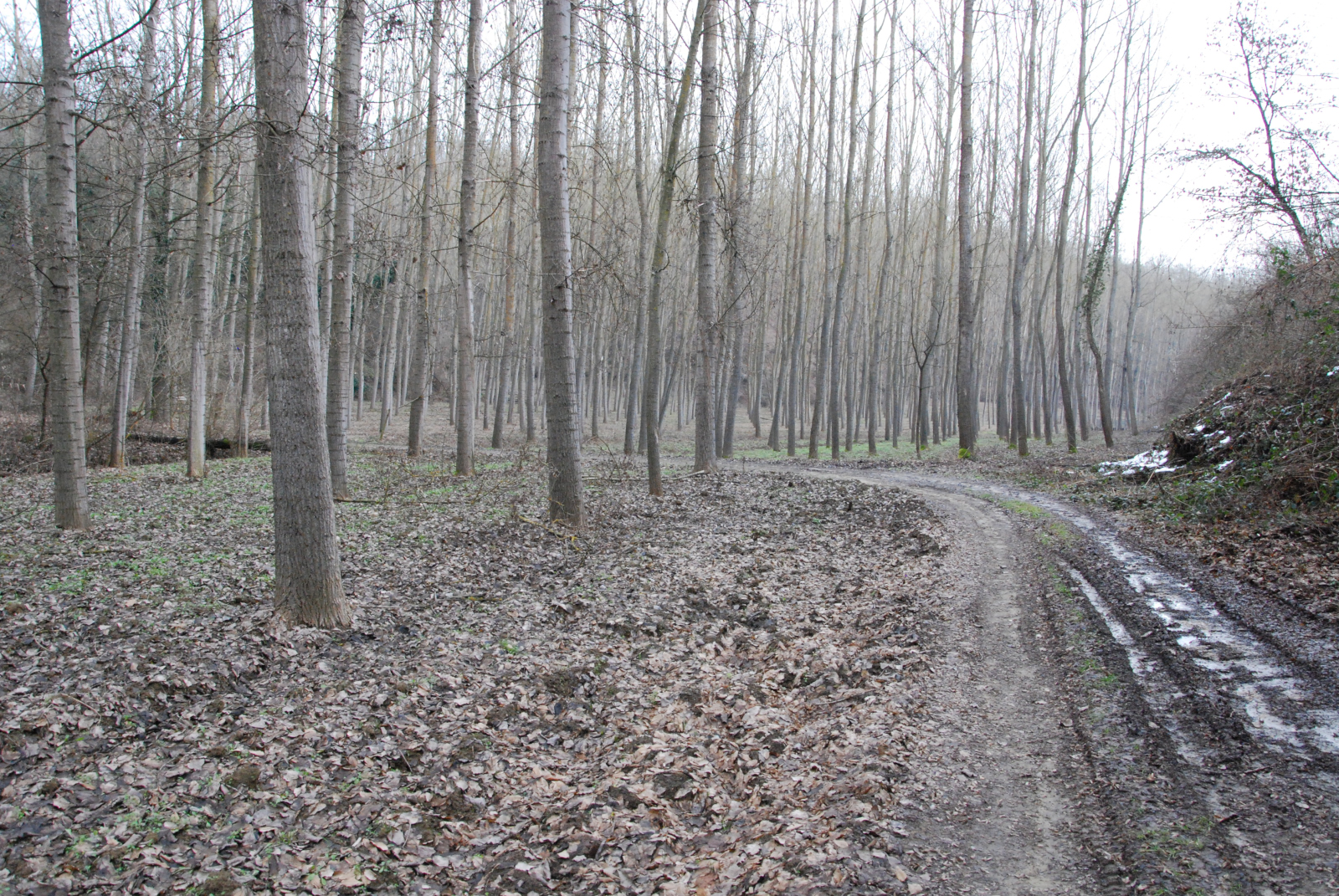 , conduce a valle dove crescono pioppi, coltivati in file regolari, ritti, paiono incassati/incastrati nella stretta valle di queste colline. Giunti al piano, li si fiancheggia per piegare a sinistra