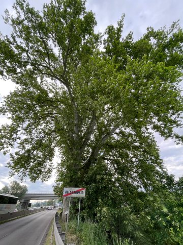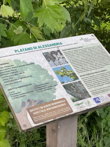 La prima volta che lo notai, con gli occhi assetati di grandezza da novello cercatore di alberi, oramai oltre vent'anni fa, toccava già la circonferenza di 760 cm, e ostentava un'altezza prossima ai quaranta metri. Alla sua base comparve un cartello curato dall'Unitrè, Percorso verde tra gli alberi della tua città, poi sostituito, recentemente, da quello di AMI – Albero Monumentali d'Italia. La circonferenza del tronco pare cresciuta di pochi cm, mentre l'altezza si è ridotta di qualche metro, a quota 36. La conformazione delle foglie, larghe, con quelle cinque punte che la fanno imparentare agli aceri canadesi, ci mostra come sia una specie dove la componente nordamericana è molto presente, poiché l'ibrido nacque dall'accostamento tra il platano orientale europeo, originario della Grecia, e il nordamericano o occidentalis, dapprima casualmente, in Spagna, e difatti talora si trova ancora la denominazione Platanus hispanica, quindi nei vivai britannici diventando a tutti gli effetti l'albero di Londra, non a caso la specie più diffusa nella capitale inglese. Da noi venne adottato poiché specie ben tollerante di smog e potature drastiche.