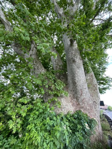 Il platano bicentenario di Napoleone ha un andamento ondoso, la sua base a circa due metri di altezza si divide nelle già citate quattro branche primarie che qui fungono da tronchi paralleli, risalendo e spiegandosi verso il campo antistante, dalla parte opposta del traffico. Ci gira le spalle come a dire: che mi importa di tutta la vostra frenesia!