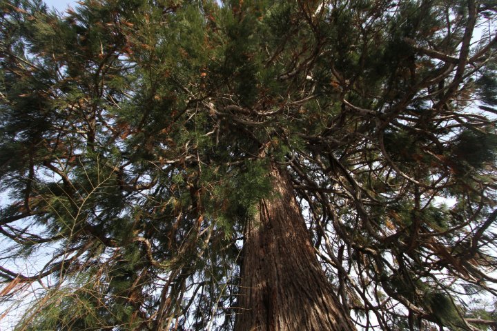 Restandoci accanto per una mezz'oretta noto che diversi passanti si fermano a guardarla, anche un signore anziano con nipotino. Si avvicinano, la guardano, raccolgono i coni a terra e ne accarezzano la corteccia, che dà una sensazione di cartone spesso. Ovviamente è una caratteristica che serve in natura per difendersi dal fuoco, tra l'altro evenienza non rara nelle sue terre d'origine, la costa pacifica di California e Oregon e ancor meglio le montagne interne della California, là dove sopravvivono gli esemplari bi-millenari più grandi del mondo, ribattezzati ad esempio General Sherman Tree e General Grant Tree, o Grizzly Giant. Questa sequoia non ha ricevuto un nome ma resta uno spettacolo: il fitto intrico di rami sospeso al di sopra del punto in cui il tronco si stringe e risale, nel quale il sole anche in una bella giornata come oggi fatica a penetrare. Sarà alta 40 metri per davvero? O qualcosa in meno? Ovviamente standoci sotto è difficile rispondere.