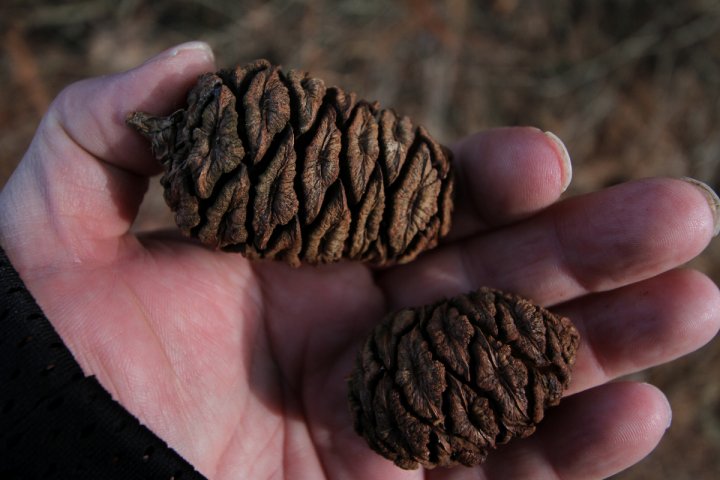 La chioma è talmente ricca e florida da ricadere fino quasi a sfiorare terra, quantomeno dalla parte posteriore, quella opposta a me, rispetto alla strada e al punto di osservazione. A terra raccolsi alcuni coni, di media dimensione, lunghi fino a sette centimetri, non certo grandi come quelli che alcune sue sorelle maturano nelle foreste della Sila, in Calabria, ma nemmeno come i coni delle sequoia giganti che radicano nel biellese, tra Pollone e Pettinengo. Il cuneese è comunque terra di adattamento di sequoie, basti pensare alle due gemelle di Roccavione, a una quarantina di chilometri di distanza, dopo Borgo San Dalmazzo, di cui una è la sequoia col piede più largo d'Italia, oltre 16 metri (12 metri a petto d'uomo).
