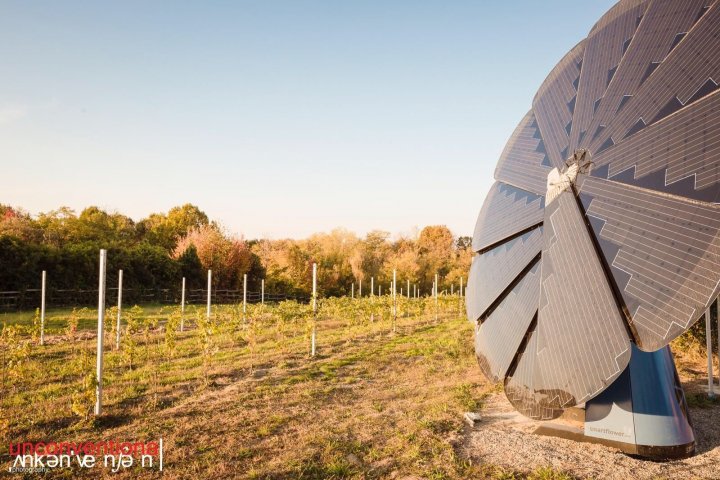 "La nuova cantina è stata ideata per avere il minimo impatto sull'ambiente circostante: il laboratorio è interrato mentre la zona accoglienza è stata realizzata all'esterno secondo i principi della bioarchitettura, utilizzando legno anziché cemento e molto vetro. Il rivestimento è in larice grezzo, un materiale che si inserisce molto bene nel contesto paesaggistico. La cantina è dotata di un innovativo impianto fotovoltaico chiamato Smartflower, che permette di ridurre l'impatto energetico: si apre e chiude in modo attomatico e produce energia pulita e rinnovabile. Anche nel vigneto abbiamo scelto di non usare cemento, realizzando i pali di testa in legno di castagno e quelli di intermezzo in ferro e acciaio".