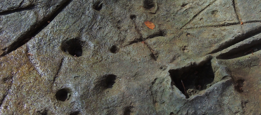 Il sentiero (cartelli indicatori-sentiero archeologico) scende a sinistra nel bosco di faggi. Seguendo i segnavia si percorre la faggeta superando mediante rustici ponticelli alcuni ruscelli sino a un ripiano dove (cartello) si piega a sinistra. Si attraversa ancora un rio e dopo poco, si incontra la prima pietra incisa, la "Roccia del Dolmen", a cui fanno seguito la "Grande Roccia, la Roccia dell'Orologio, la Roccia a Polissoir" e dopo una breve salita la "Pietra Scritta".