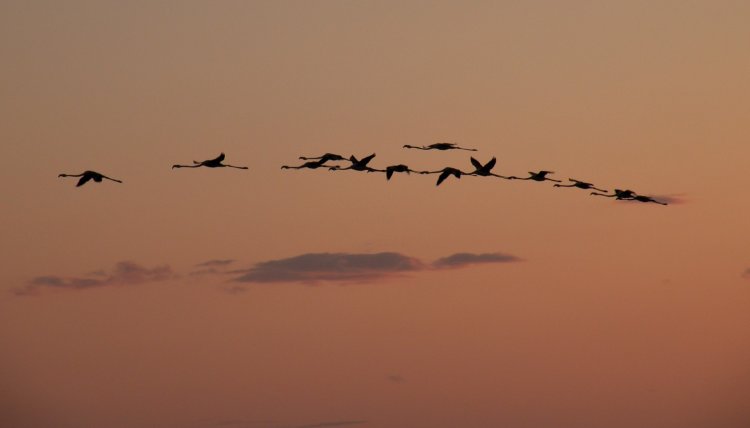 Un volo di uccelli rosa e neri, eleganti eppure buffi, dalla silhouette inconfondibile, sta passando davanti al tramonto infuocato. È sera e i genitori rientrano alla colonia per portare l'ultima razione di cibo al proprio pulcino. L'isola dei fenicotteri brulica di zampe e colli lunghissimi, di impacciati pulcini grigi e di slanciati e flessuosi adulti. Con il vento a favore si ode un continuo e gutturale ronfo, un'apoteosi di versi che provengono dagli oltre trentamila uccelli accalcati sulla piattaforma fangosa. Uno spettacolo che non lascia indifferenti. Per garantire la nidificazione e tenere lontani i predatori terrestri vengono regolati i livelli delle vasche, il sale può essere risorsa ma anche opportunità di tutela, per fortuna.