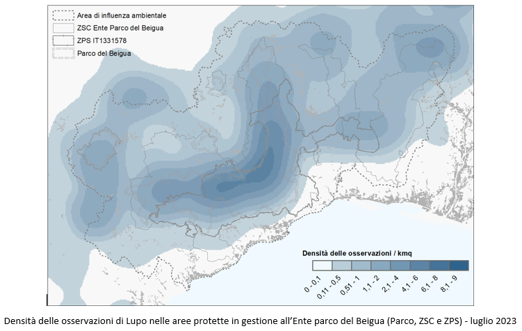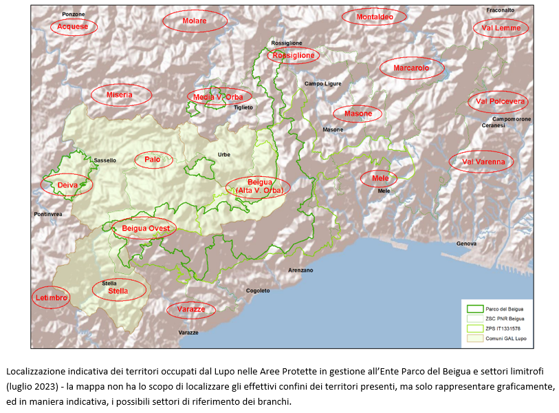 Valutando congiuntamente tutte le informazioni derivanti dalle diverse tecniche di monitoraggio, le fonti bibliografiche e i dati inediti forniti anche da volontari, nelle Aree protette in gestione all'Ente Parco del Beigua (un Parco, 4 ZSC e 1 ZPS, per complessivi 258 chilometri quadarati), si è osservato, sia sul medio che sul lungo periodo, un incremento generalizzato di areale, di numero di branchi presenti (da 3 negli anni 2012-2013, a 13-15 al luglio 2023) e di frequenza degli eventi di trappolaggio video-fotografico