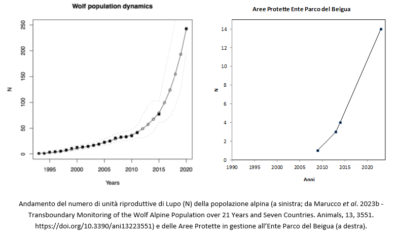 La situazione osservata nelle Aree Protette del Beigua risulta in linea con l'andamento delle popolazioni di lupo evidenziato a livello nazionale nell'ambito delle attività di monitoraggio coordinate da ISPRA-MITE e del progetto LIFE WolfAlps EU e di arco alpino