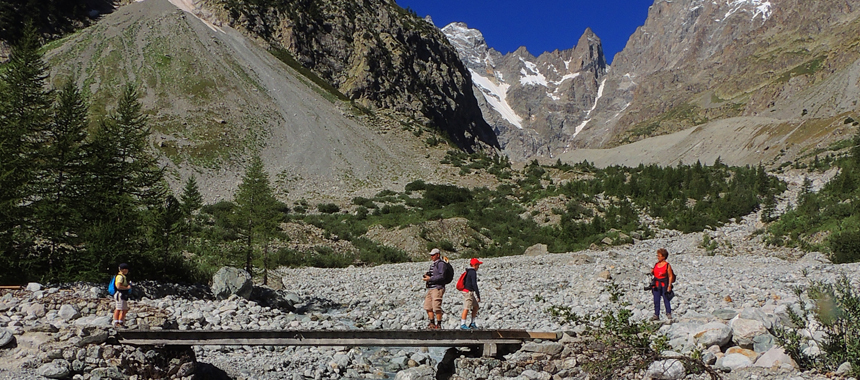 Valli strette e sinuose risalgono sino al cuore del massiccio ciascuna con le sue particolarità e le sue originalità: alcune solitarie e quasi dimenticate come la Valgaudemar, altre d'estate come Ailefroide, super frequentate. A Venosc si possono toccare con mano le contraddizioni dello sviluppo: da un lato la telecabina ipertecnologica che porta ai 15.000 posti letto di les Deux Alpes, megastazione dove è possibile anche lo sci estivo, di fronte il sentiero che sale alla cascata della "Pisse" e raggiunge il rifugio ed il Colle della Muzelle uno degli angoli naturalisticamente più interessanti e solitari degli Ecrins.