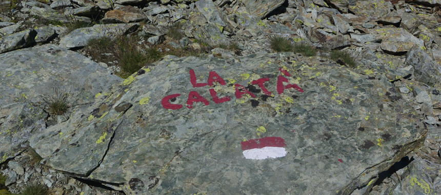 Le tacche segnaletiche conducono a superare senza problemi una fascia di rocce montonate, pervenendo così in una vasta conca detritica, ingombra di neve fino a stagione inoltrata. Un ambiente decisamente più aspro, tipico dell'alta quota "Monviso". Inizia il tratto più faticoso (difficoltà EE): badando a non smarrire i segnavia si rimonta a sinistra (lato orografico destro della conca) un pendio di detriti instabili e con un ultimo traverso a sinistra si guadagna l'ampia sella detta "La Calatà". A 2940 metri, il più rapido passaggio fra Pontechianale e il Pian del Re.