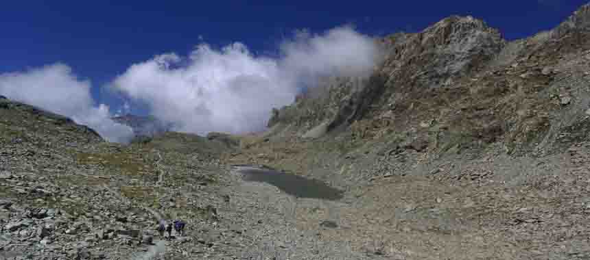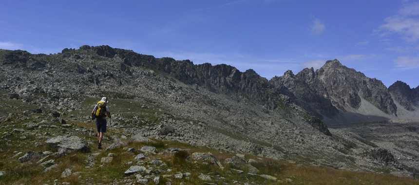 Tornati alla sella si cala il versante opposto: sempre ben segnato il sentiero traversa a destra e con un ultimo tratto più ripido guadagna il fondovalle, dove si incrocia il sentiero principale del Tour del Viso. Che guiderà per un buon tratto i passi: a destra, in lieve ascesa, si perviene al Passo di San Chiaffredo (2760 m), storico collegamento fra le valli Po e Varaita. In basso lo sguardo divaga sui vasti ripiani Gallarino, con gli omonimi specchi d'acqua, accanto ai quali transiterà uno dei due percorsi "a scelta" del giorno a venire.