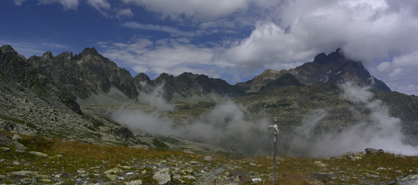 Di fronte sta la parete sud del Monviso, via normale di salita alla cima, con le immancabili nebbie estive che salgono dalla Valle Po. A destra, di là del Colle delle Sagnette, appare la sagoma luminosa del Monte Rosa e, in basso, si intravede la mulattiera proveniente dal vicino Passo di San Chiaffredo, animata dai camminatori del Tour del Viso. Un colpo d'occhio ragguardevole, che può migliorare ancora. A sinistra un traccia di sentiero consente infatti di guadagnare senza eccessive difficoltà la cima della Punta Malta (2995 m), per respirare l'aria dei "3000" e per spingere lo sguardo a occidente. E per osservare in basso i laghi Lungo e Bertin, frammenti di "dolcezza" nell'ambiente aspro dell'alto Vallone delle Giargiatte. In mezzo si scorge il Bivacco Bertoglio, rifugio davvero esiguo in questo angolo selvaggio.