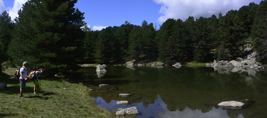 Cembri e ancora cembri. Come premesso, il consiglio è di non limitare la camminata alla salita al Bagnour ma di utilizzare la giornata per un lungo "vagabondaggio" nell'Alevé. Da Alboin in un'ora di salita tranquilla si giunge alle Grange Pralambert (1800 m), inferiore e superiore, panoramico ingresso nel bosco. Le conifere, cembri e larici, subentrano alle latifoglie e accompagnano con cammino più disteso in direzione nord. Lasciata a sinistra una via di discesa alle borgate Villaretto (di Casteldelfino) e Castello (di Pontechianale), si giunge al Lago Secco (1890 m), piccolo invaso in cembreta quasi pura, il cui toponimo è legittimato dalla condizione estiva (a seguito alla deviazione dell'acqua di una vicina sorgente, oggi anche in piena estate il lago "secco" più non è...).