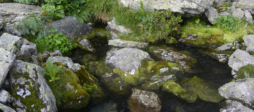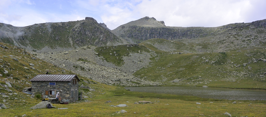 Si scende, dopo tante pietre è un piacere dirigersi verso accoglienti pianori erbosi. In breve si lascia a sinistra il sentiero principale del tour (diretto al Quintino Sella e al Pian del Re) e si segue a destra la diramazione per il Rifugio dell'Alpetto. Passato un avvallamento erboso con annesso laghetto si attraversa un'ultima conca rocciosa, dove si incontra il sentiero di collegamento diretto fra Alpetto e Quintino Sella. Lo si segue a destra, guadagnando con alcune risvolte il pianoro dove scorre il Rio dell'Alpetto. Pochi passi a sinistra conducono al sito di risorgenza, dove il rio sgorga copioso alla base di una parte rocciosa. Una variante brevissima, per un angolo di indubbio fascino, ideale premessa agli ultimi passi della giornata. Ma il rio continua a stupire, a creare suggestione con i suoi meandri, poi si accomiata precipitando in una gola. Il salto d'acqua si smorza nel sottostante vasto pianoro, dove appare inatteso il Lago dell'Alpetto. Ma soprattutto, discosto a sinistra, appare l'omonimo rifugio, prima il "vecchio" e poi il "nuovo".