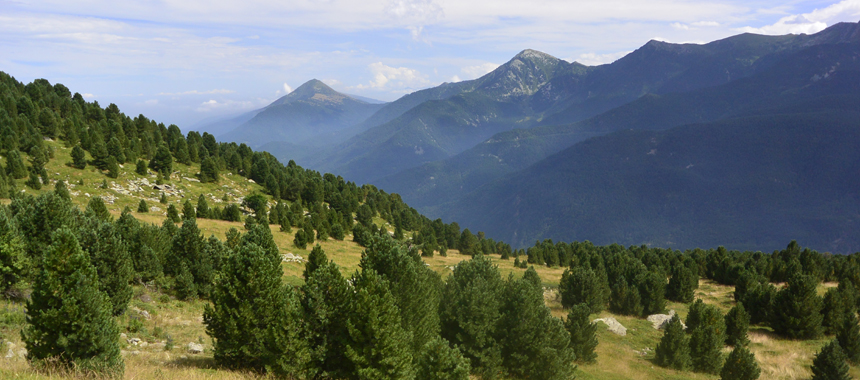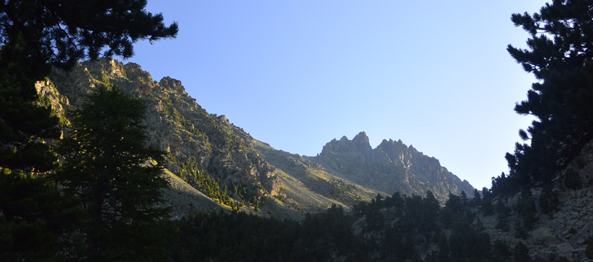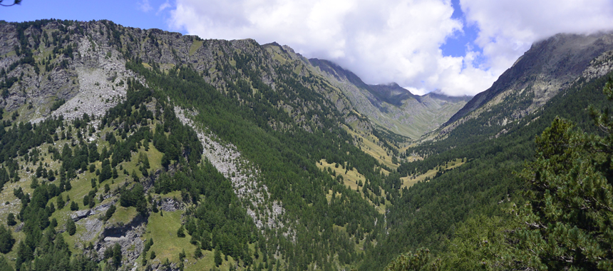 Tornati sul sentiero principale si cambia direzione di marcia volgendo a nord-est in salita trasversale sul fianco sinistro del Vallone delle Giargiatte. In alto fa capolino la cima del Monviso, ma la meta intermedia è assai più vicina: il caratteristico Pion Meyer (2130 m), ampia radura al limite nord dell'Alevé, nel punto in cui il bosco si spinge nel Vallone delle Giargiatte. Sul Pion Meyer è usuale incontrare camminatori impegnati nel Tour del Viso, la radura è infatti attraversata dalla mulattiera (percorso GTA) che collega il Passo di San Chiaffredo al Vallone di Vallanta. Ed è il vallone la prossima meta: dopo opportuna sosta, si scende a sinistra ancora nel bosco, qui di cembri più radi e misti a larici, guadagnando in circa mezzora il fondovalle, annunciato dalla scroscio d'acque del Rio di Vallanta. Sulla riva opposta transita la mulattiera che collega Castello al Rifugio Vallanta, verso l'omonimo colle, passaggio verso il Queyras del Tour del Viso. Mulattiera alla quale si riserva solo uno sguardo: a pochi metri dalla riva sinistra del rio si incontra infatti la via di ritorno nell'Alevé.