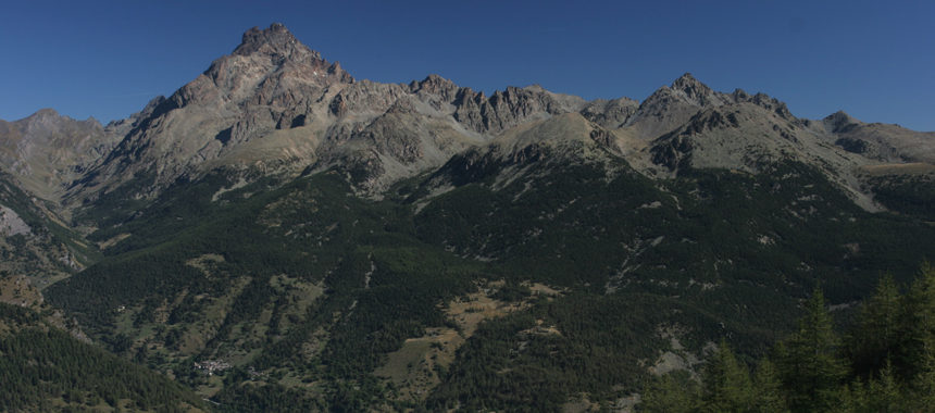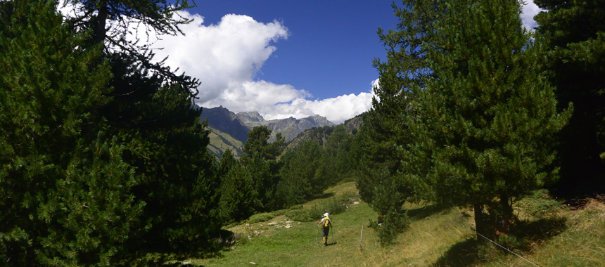 A indicare la direzione pensano anche i cembri, giovani cembri che via via si espandono a oriente, conquistando spazio sul versante sinistro orografico (al sole) della Valle Varaita. Un fenomeno ormai in atto da alcuni anni, favorito dall'abbandono del pascolo. Ed è così che il bosco di pino cembro si riprende spazi che erano suoi millenni or sono... Passato dopo breve salita un costone si scende per morbide ondulazioni guadagnando il valloncello delimitato a ovest dall'ennesima costola: è qui che si trova, ormai in parte nascosta dai cembri, la Croce di Ciampagna (1995 m), luogo denso di storia locale, fino ad alcuni anni or sono limite orientale riconosciuto del Bosco dell'Alevé. Alla Croce di Ciampagna ci si immette sul sentiero principale, Viol dell'Alevé (viol, sentiero), proveniente dalla Madonna della Neve. Si attraversa così il Vallone di Ciampagna e in lieve discesa si giunge a un bivio: a sinistra un sentiero scende diretto alla Borgata Bertines e a Casteldelfino, ma è meglio continuare a destra in lieve salita. Il bosco ha ormai la meglio, anche in quella che fino a pochi anni fa era una delle radure più belle dell'Alevè: il Pian del Chiot (2050 m). Passata la radura, al successivo bivio si consiglia di andare a destra (a sinistra scende un altro sentiero per Bertines) seguendo l'indicazione per le Grange Pralambert e il Rifugio Bagnour. Con un lungo traverso ci si riporta così sulla via percorsa due giorni prima.