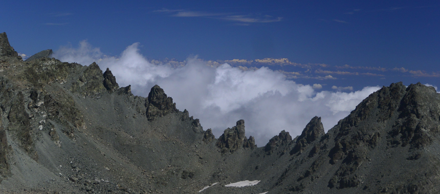 "Gallarino" è anche il nome del passo successivo che si guadagna con un traverso sul pendio sud di Punta Dante. Il Passo Gallarino (2730 m) schiude nuovi orizzonti a nord: sul Viso (intero) e sul Viso Mozzo, sull'ampia sella del Colle di Viso e sul Lago Grande, che visto di qui tanto grande non appare... Ai piedi della cresta del Mozzo appare anche la sagoma del Rifugio Quintino Sella, frequentato punto di appoggio per il tour e la salita alla cima del Sovrano delle Cozie.