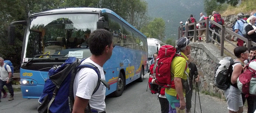 Lungo la bella mulattiera ottocentesca i partecipanti scendono fino all'Alpe della Pissa, dove si riposano per un po'. Di qui la processione riparte lenta e solenne, con pellegrini e pellegrine incolonnati due a due dietro ai "bâtonniers" ("bastonieri") che regolano il passo della processione, seguiti dalle autorità comunali ed ecclesiastiche. Alla scorsa edizione, quella del 2015, parteciparono ad esempio oltre al sindaco di Biella e alla sindaca di Fontainemore ben quattro vescovi: quelli di Aosta e Biella, "padroni di casa", e quelli di Casale Monferrato e Ventimiglia, molto legati per motivi personali al culto della Vergine Nera. Attorno a mezzogiorno i pellegrini giungono tra canti e preghiere alla Basilica Vecchia e, prima di entrare in chiesa, si inginocchiano baciando i gradini in pietra della scalinata di accesso. Parteciperanno poi alla messa del pomeriggio, chi lo desidera potrà confessarsi e alla sera si svolgerà una fiaccolata attorno al Santuario. Dopo aver passato la notte nelle camere o negli stanzoni della foresteria del Santuario, il giorno seguente i fedeli valdostani prenderanno ancora parte alla liturgia mattutina per fare poi ritorno al proprio paese.