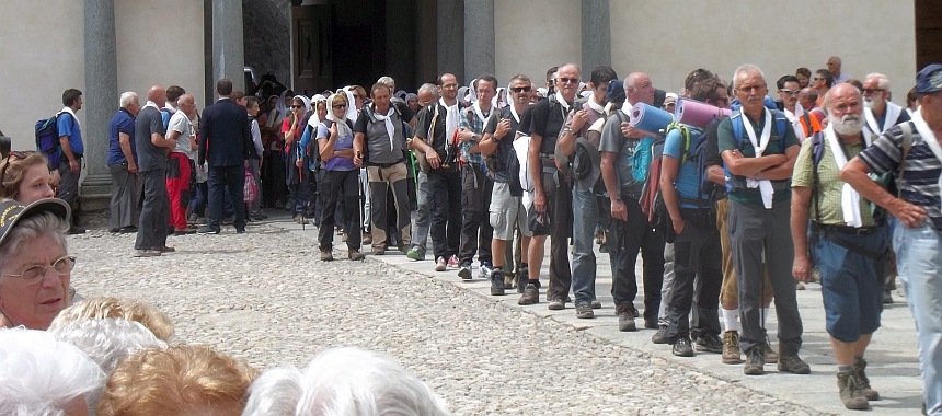 A fianco della mulattiera alcuni sacerdoti recitano le decine del rosario e brani di letture spirituali per favorire il raccoglimento nel corso della salita. Dal colle i pellegrini scendono in breve al piano della Ceva, dove in piena notte si dispongono ad aspettare l'arrivo di un gruppo di parrocchiani partiti da Pillaz a mezzanotte che portano in forma solenne croci, lanterne e stendardi, i simboli della devozione popolare. All'alba tutti insieme ripartono e, dopo essere passati nei pressi delle cinque croci erette in ricordo di un tragico incidente del passato, scendono al pianoro nei pressi della stazione di arrivo della seggiovia del Lago del Mucrone. Qui recitano solennemente il "Salve Regina" e la processione si sdoppia. Donne e ragazze infatti, molte con il tradizionale velo bianco, proseguono la processione separate dagli uomini, i quali portano invece al collo come simbolo della propria devozione un fazzoletto di tela bianca.