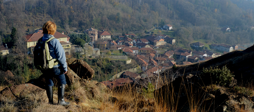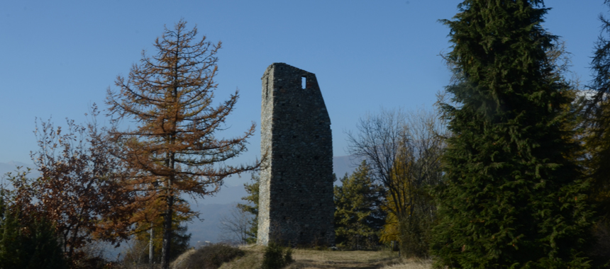 Appena sotto la torre il segnavia del sentiero 751 indica la strada da seguire per scendere alla sottostante spianata. Il sentiero si abbassa ripido tra le macchie di roverella e giunge a un bivio: a destra è il percorso di ritorno che consente di raggiungere il parcheggio senza risalire alla Torre. Si prosegue confluendo in un largo sterrato e superato il piazzale risistemato alla belle meglio dopo i lavori di cava, si piega a destra. Quasi subito ritroviamo il sentiero e un ambiente che adesso è quello tipi dei Monti Pelati, un oasi xerotemica con rada vegetazione. Dopo alcuni saliscendi si giunge nei pressi dei ruderi della chiesetta dedicata a San Rocco e San Grato: si tratta di due santi taumaturgi molto venerati in ambiente rurale. Grato, vescovo di Aosta è invocato come protettore dei raccolti dalle tempeste, specie dalla grandine. Rocco da Montpellier gran viaggiatore e popolarissimo nel Medioevo , come protettore dal terribile flagello della peste, e invocato per salvaguardare il bestiame. La cappella che sorgeva in una località strategica è abbandonata da decenni e i pochi ruderi inarrivabili si ne intravedono a malapena nella fitta e impraticabile vegetazione arbustiva.