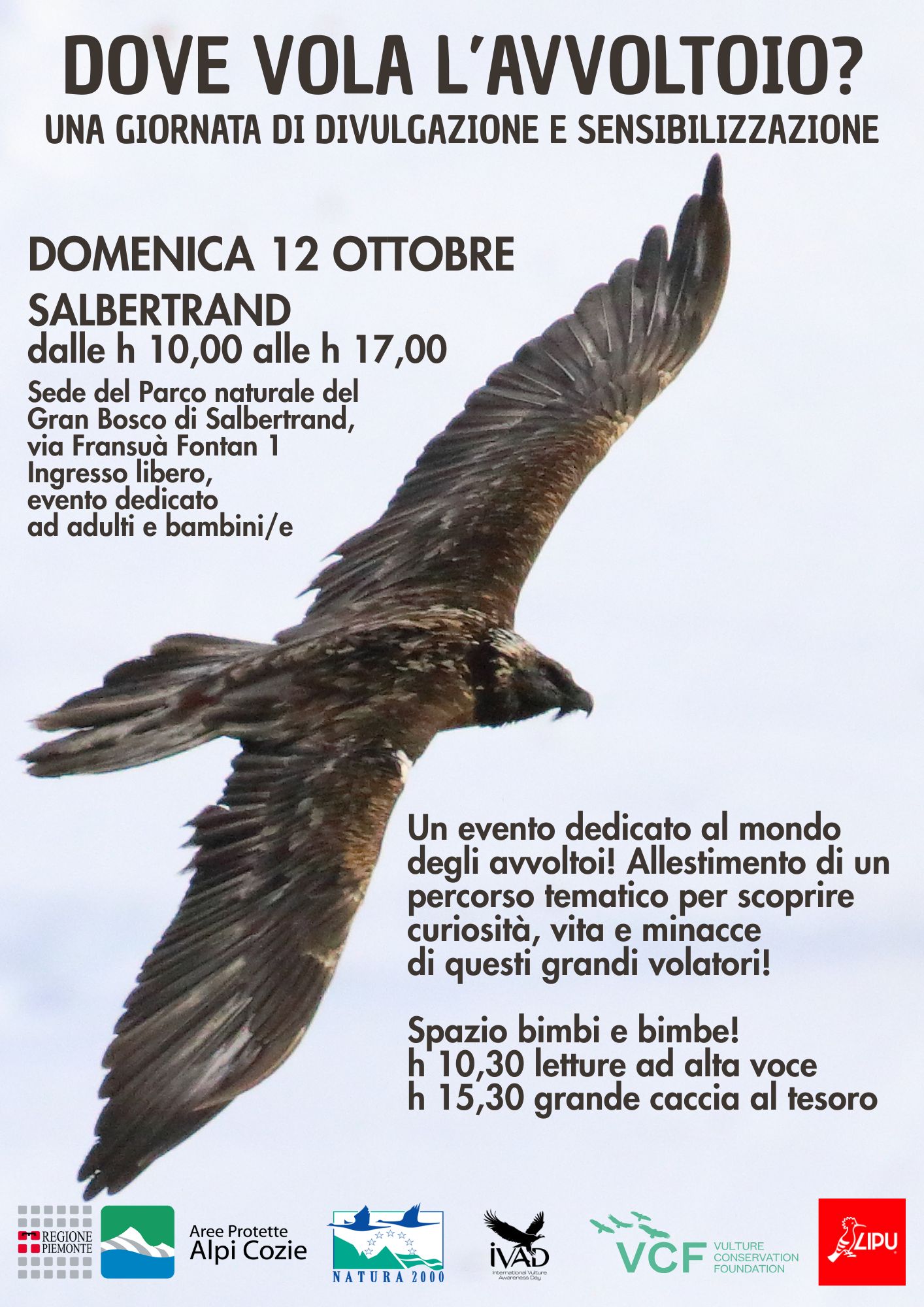 La giornata, organizzata dall'Ente di gestione delle Aree Protette delle Alpi Cozie in collaborazione con LIPU, si inserisce in un più vasto programma di eventi legati alla Giornata Internazionale di Sensibilizzazione sugli Avvoltoi (IVAD International Vulture Awareness Day) che si celebra ogni anno il primo sabato di Settembre e ha l'obiettivo di dare voce a questi sottovalutati custodi della natura e ispirare azioni significative per la loro conservazione.