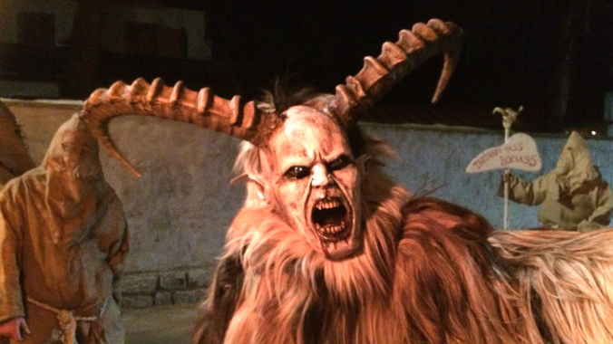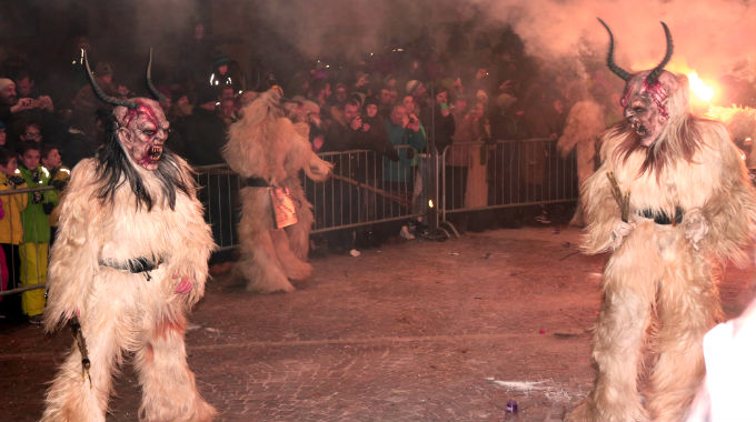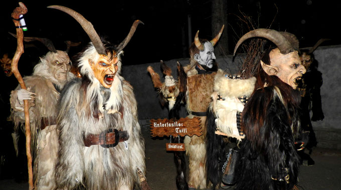 Trattasi invece dei Krampus: uomini-caproni cornuti, personaggi demoniaci tra il ferino e il selvatico. Fattezze orribili, la faccia coperta da maschere mostruose, vestiti sommariamente con abiti stracciati e più frequentemente di pelli. Un campionario di mostruosità difficile da immaginarsi. Si aggirano irrequieti per le strade, in teoria alla ricerca dei bambini "cattivi".