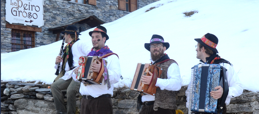 Il gruppo carnevalesco entra in azione dopo un pranzo conviviale il pomeriggio del sabato grasso (in passato si iniziava già il giovedì). Un uomo vestito di pelli con una maschera carnevalesca e un campanaccio ,il lupo, è portato in giro legato da funi per il paese. Il lupo cerca di scappare e di dar prova della sua forza imbrattando di nero che giunge alla sua portata. Ad accompagnare l'irrequieta brigata sono i suonatori per i quali ogni occasione è buona per dar vita ad un estemporaneo ballo al suono delle melodie occitane tramandate in valle da suonatore a suonatore.