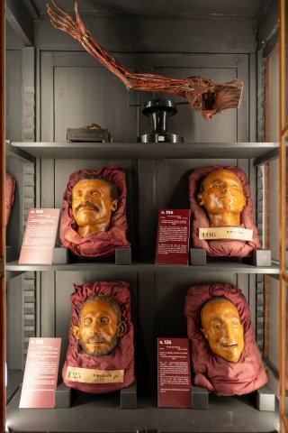Accanto alla Wunderkammer emerge la sezione dedicata a Lorenzo Tenchini (1852-1906), con le celebri maschere in cera ottocentesche realizzate nell'ambito degli studi di antropologia criminale. Volti, crani, encefali e documentazione manoscritta restituiscono un ritratto potente e controverso della scienza del tempo, sospesa tra rigore anatomico e teorie oggi superate. Tenchini può essere considerato un antesignano della moderna neuroanatomia: le sue maschere in cera e i preparati anatomici del cervello rappresentano un unicum scientifico ottocentesco e documentano un approccio di studio innovativo per l'epoca. Pur muovendosi in un orizzonte culturale influenzato dalla scuola lombrosiana, Tenchini sposta l'attenzione sull'encefalo, con l'obiettivo di indagare possibili correlazioni tra struttura cerebrale e comportamento, gettando le basi per studi più complessi e, in chiave pionieristica, per un approccio più funzionale alla comprensione di tale organo.