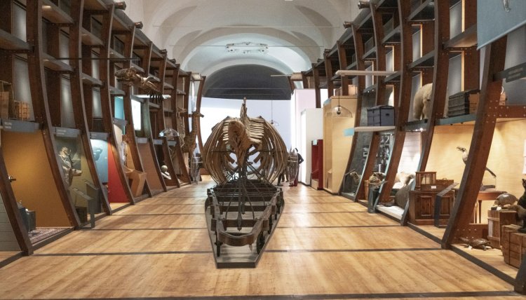 Dominante, nello spazio chiamato Arca delle esplorazioni, è lo scheletro di una Balenottera comune che si spiaggiò a Bordighera, nel lontano 1844, pare in seguito a una lesione spinale. Cristina ci racconta che del cadavere del cetaceo, la popolazione sfruttò la carcacassa per ricavarne olio destinato all'illuminazione, mentre lo scheletro fu montato nel 1852 da Giuseppe Cantù, abile tassidermista dell'epoca, su una singolare armatura che troneggia al centro dell'Arca. Questi locali, allestiti dall'architetto Andrea Bruno come la stiva di una nave dell'Ottocento, ospitano i reperti delle preziose Collezioni scientifiche che risalgono al 1700. Qui troviamo i reperti più interessanti e singolari del Museo che accompagnando il visitatore in un viaggio "attraverso le esperienze di grandi esploratori - piemontesi e non – che raccontano da dove provengono le collezioni dell'istituzione museale", ci spiega la nostra guida. Il nuovo allestimento vuole essere un viaggio immersivo grazie al quale scoprire il ruolo che ebbero le esplorazioni del passato nella storia naturale, cominciata con il viaggio del Beagle, il brigantino che, nel 1831, portò Charles Darwin, a soli 22 anni, in una spedizione scientifica tra America e Oceania, dalla quale scaturì la teoria della selezione naturale.