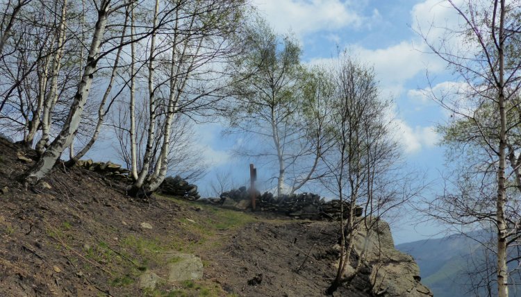 Purtroppo, e con gran rammarico, oggi nel sentiero si vedono ancora i danni provocati dai roghi scoppiati lo scorso autunno: betulle sradicate, zolle di terreno divelti, piante bruciate.