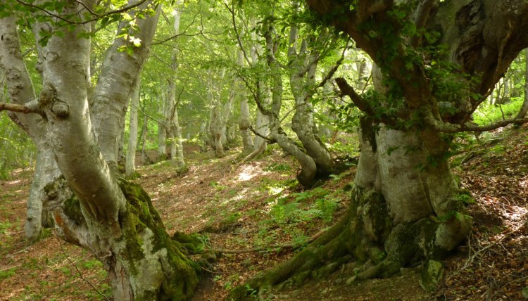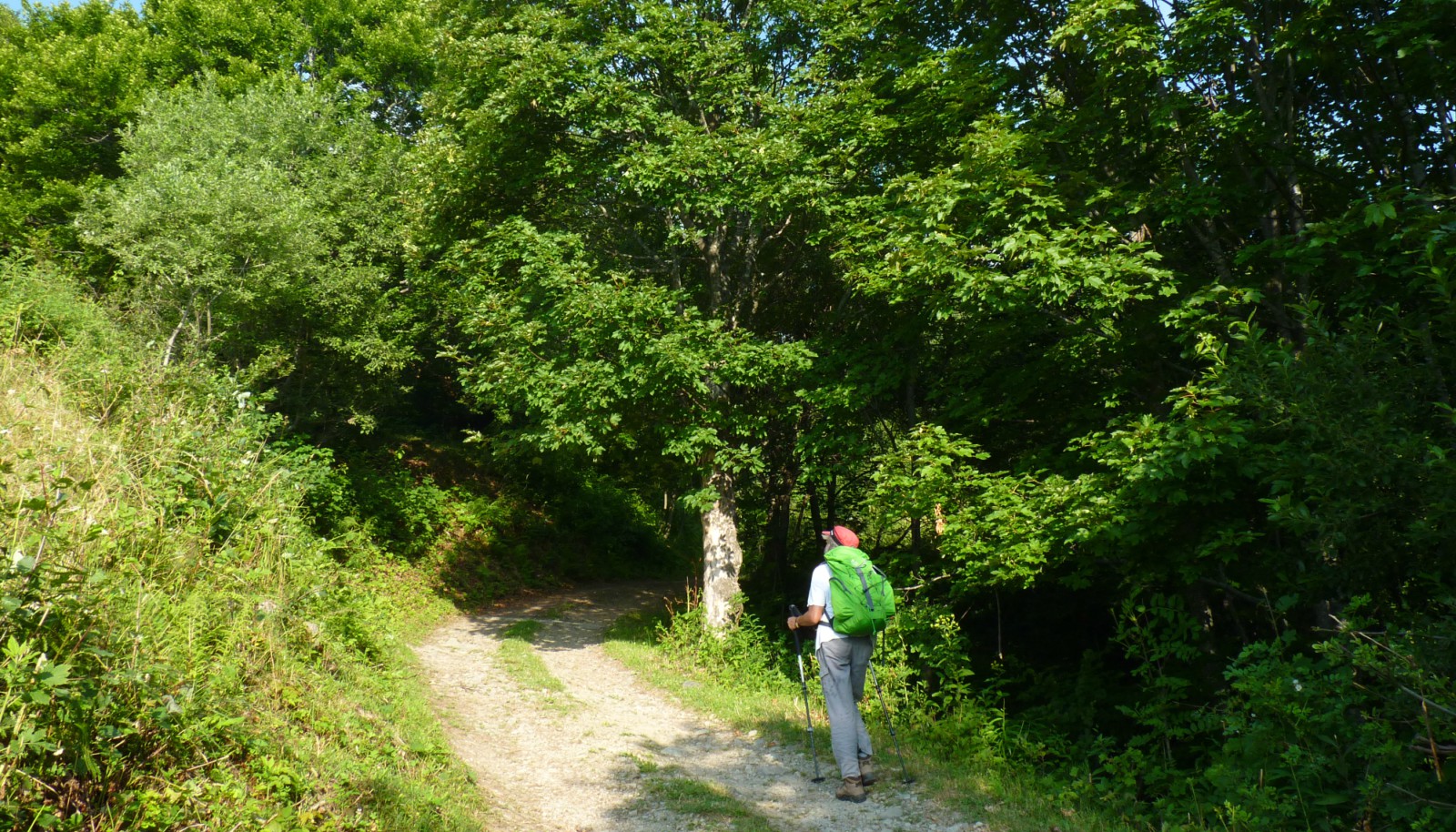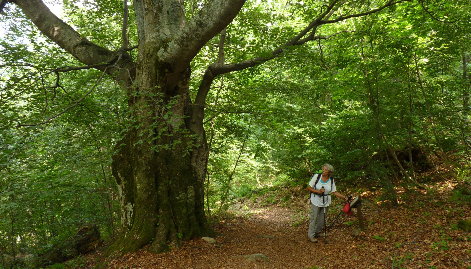 Si torna lungo la mulattiera seguita in salita. Giunti allo stradello (1,10 ore), lo si percorre per circa 500 metri e poco prima del tornante si incrocia il Sentiero Natura. Lo si segue verso destra, in piano e con una breve salita diagonale. Dal pannello illustrativo del ciliegio il sentiero inizia a scendere tra suggestivi faggi secolari dai tronchi contorti, quindi tocca il più grande faggio del parco