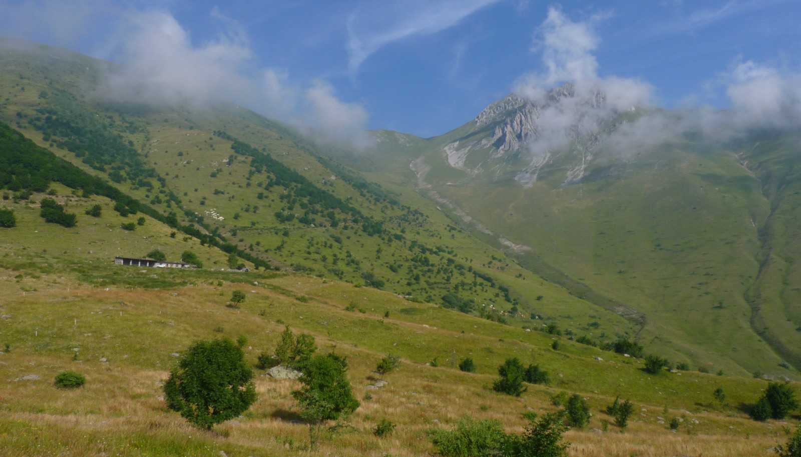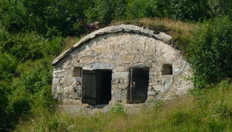 Si risale piacevolmente il costone con a destra il Gias Garbella e a sinistra i pascoli del Gias del Chiot e un antico edificio con volta a botte