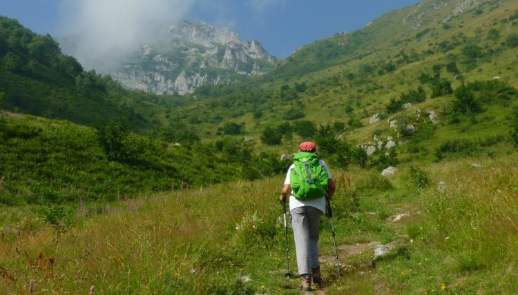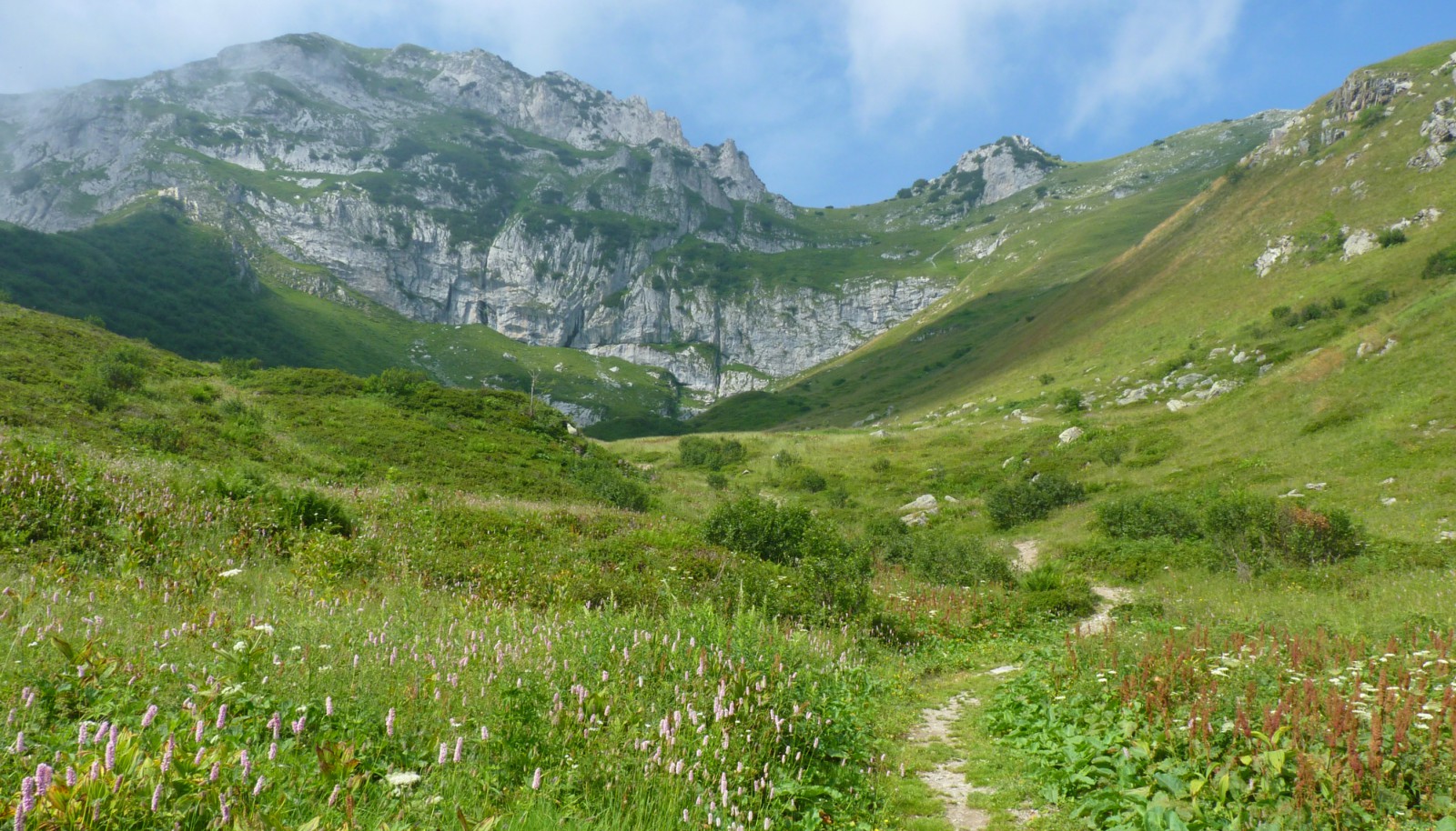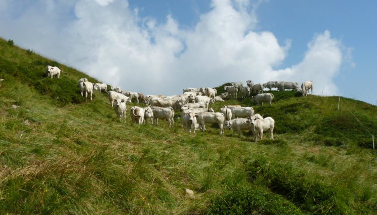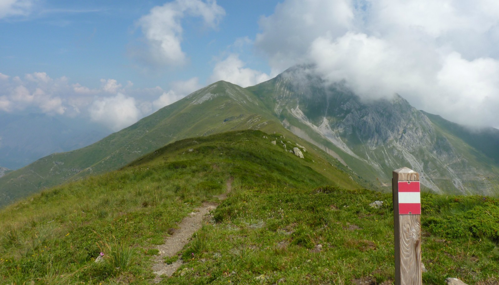 . Si lascia a sinistra il Sentiero Natura del bosco di faggi (che si percorrerà al ritorno) e si prosegue sul viottolo che fa tre tornanti e incrocia il Sentiero Natura. Lo stradello ombreggiato dalle betulle giunge a un bivio con cartelli (0,35 ore). Si va a destra, incontrando dopo pochi passi un altro palo con cartelli: qui si abbandona la stradina per prendere il sentiero che sale in diagonale. Si arriva subito su un costone erboso dove il panorama si apre sulla conca di pascoli del Gias Garbella